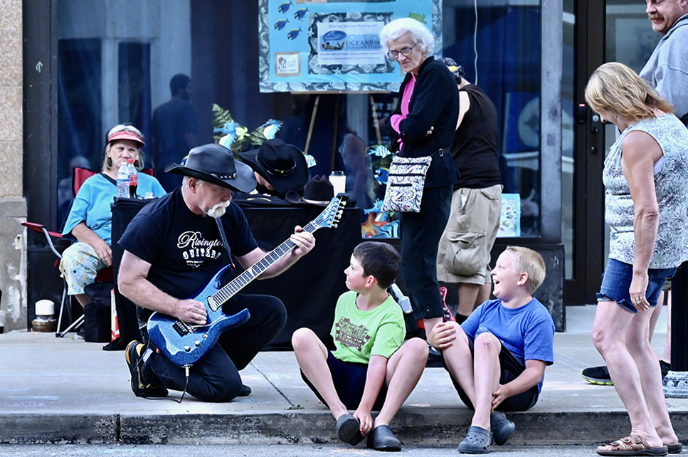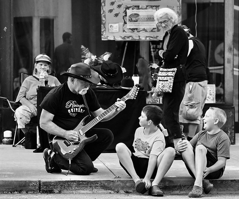 Heidi, interesting image. I like the interaction of the guitarist with the children as they have direct eye contact and the kids are having a good time given by the body and face language. The image is additionally complemented by all the passersby looking at their communication. The image is sharp but it looks too bright so I decreased it, and yes the image can be cropped as you mention and I also made the vertical lines straight. That caused some additional amputation to the man at the edge of the frame, but you can still see his eyes (important point).