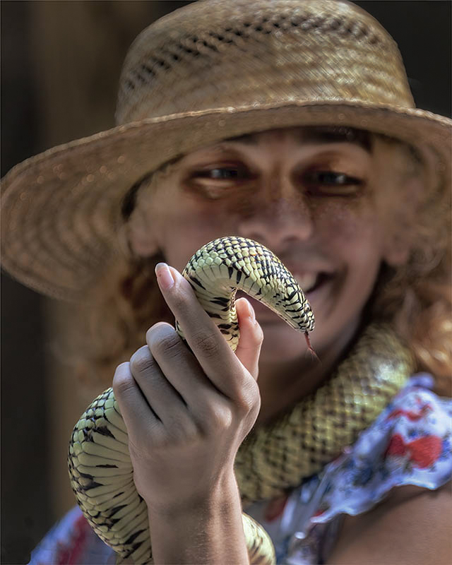 Gloria, actually I like the image as is. If you were to make the face and eyes sharp the same as the snake it would be conflicting, this way the main subject is the snake held by the woman, and the background is clear enough to see her face and really prove that she is not afraid to hold it.
