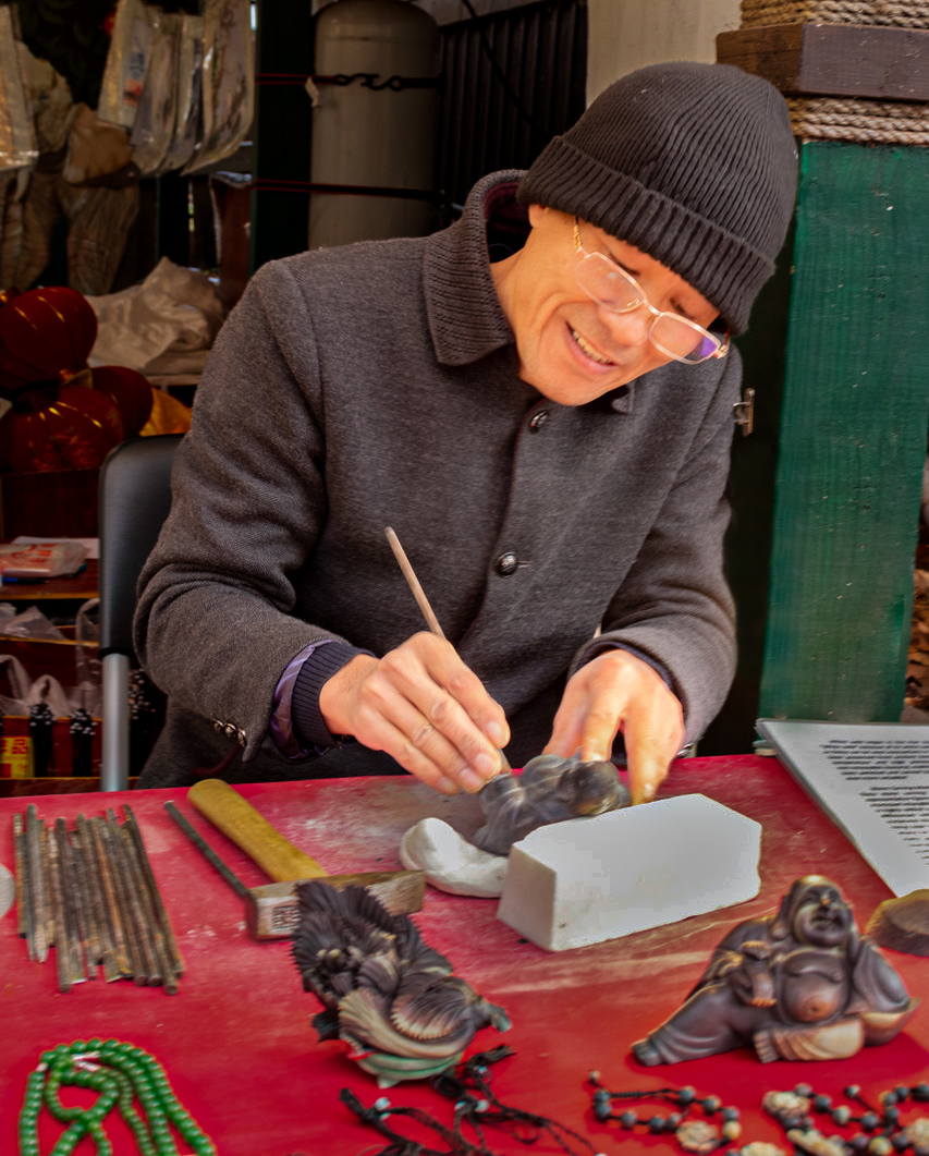 Sally, it is very interesting to observe as how these expert individuals can create a beautiful and detailed piece working with rough instruments. You can see his face expression as how he is enjoying what he is doing and reflects that he is sure of what he is doing. I tried to make the green pillar straight but that will amputate the buddha at the front of the table which is part important of the whole picture, so I did not. I did clone out completely the light bulb and all the brightness around it since it was taking away prevalence of the artist and his products. Also cropped some from the top since it is only adding more distraction also making the background a little darker. |