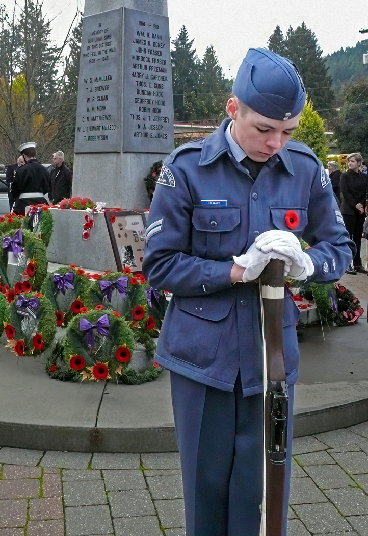 Ed, this image really expresses respect and appreciation in the memory of those that lost their life during World War I marking the end of it in 1918. It is also known as Armistice Day, and celebrated on November 11th. The body and face language of this young man really makes the image, complemented by the monument in the back with the names of the fallen. It is customary to wear and show the poppy flower as seen here. The reason the poppy is worn is because it was noticed back then by a Canadian physician and poet, how quickly the poppies had grown over the graves of soldiers who had died during a battle. I just added some light to the soldier to make him stand out |