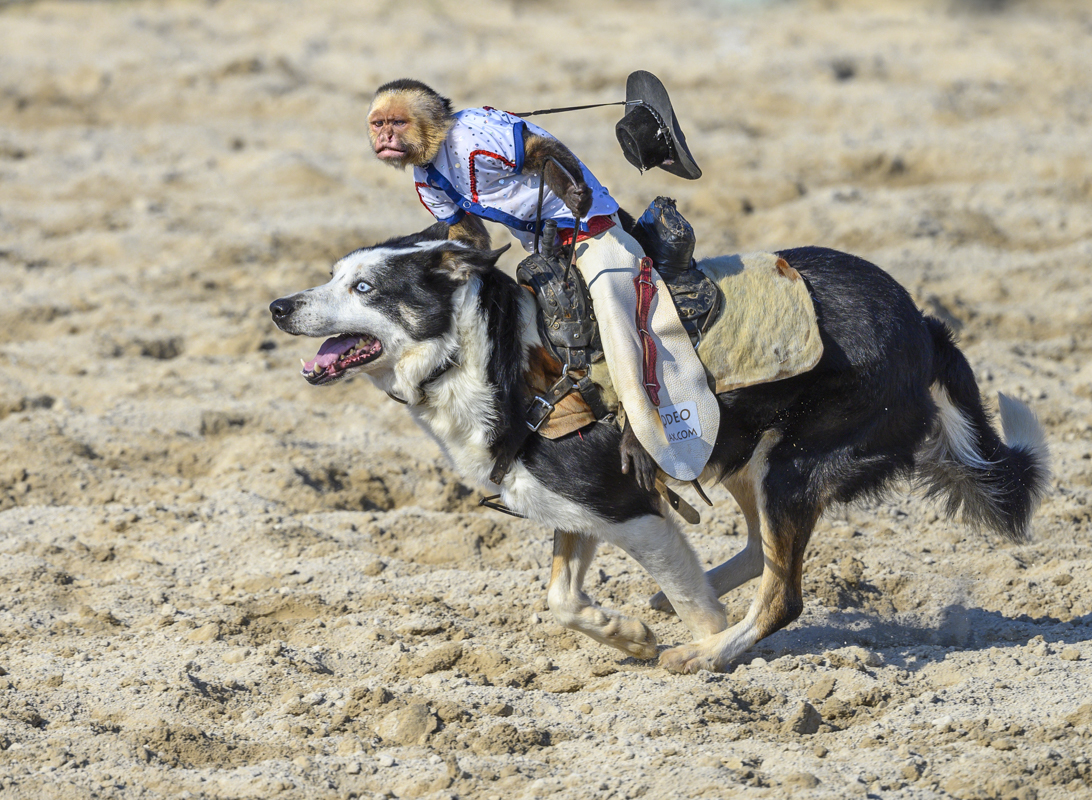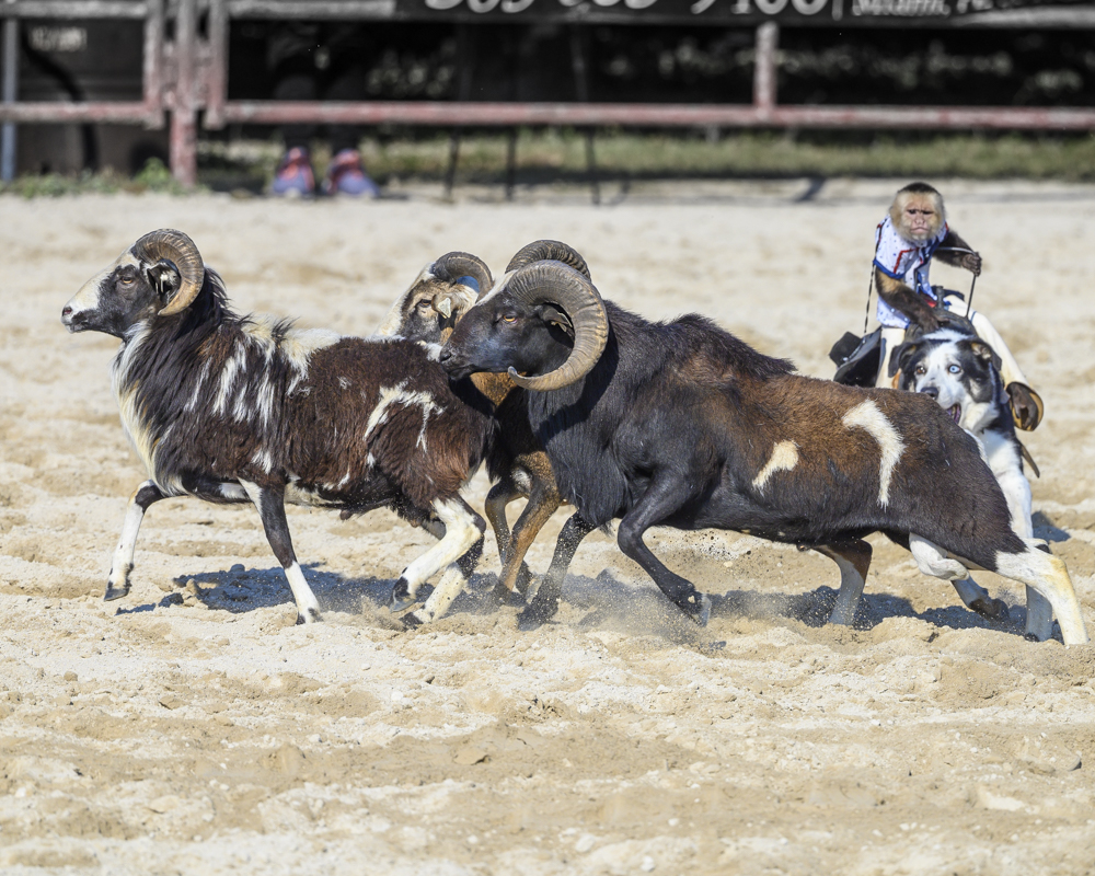 Kerry, interesting image. The dog is really sprinting. The image is sharp, I probably would have given a little more room in the front for the dog and sheep run into. You were in a low vantage point which is desirable and have the contenders at eye level. The background, specially the white banner is somehow distracting but there is nothing you can do about. Here in Florida at the Rodeo in Homestead, they also release a dog to chase some big horn sheep and take them to a specific point. The same dog also comes out with a very unusual rider. Image attached for illustration |