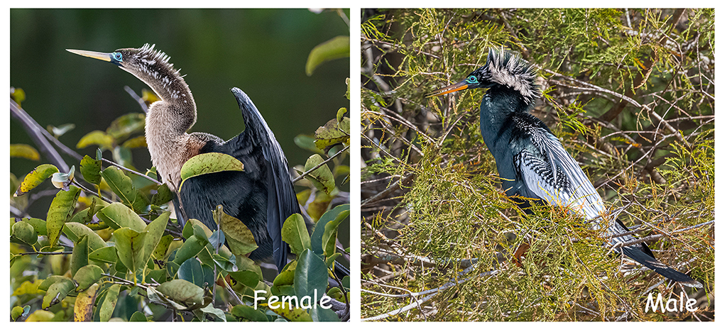 Maria, here in USA these birds are called anhinga or snakebird which are professional underwater fishers the same as the cormorants, and since they do not have an oil producing gland, the feathers get wet and need to be dried with the wings open and looking away from the sun, which also helps them recuperate warmth. Your image is of a female in normal plumage. During the matting season, both male and female will have darker feathers and a blue patch around the eyes (images attached for illustration). Your image is sharp, and shows the bird in a tense attitude. |