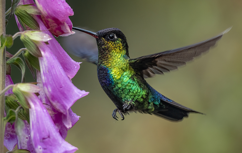 Adrian, what a beautiful hummingbird and how nicely photographed by you in peak of action and with almost completely frozen wings. I read somewhere that they can move them up to 2400 times per second, so we would need a shutter speed slight higher, however, there is nothing wrong of having a slight motion blur. The bird is tack sharp, and his position in the frame shows great composition. I jus made the flowers stem straight. The additional original really displays the beauty of this variety. On another topic, I recently saw an article written by a Brazilian photographer that he was able to record a rainbow of colors in the wings of the black hummingbird when it is back lighted by the sun, like a prismatic effect. The article is in Spanish, but the images speak by themselves.