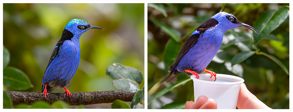 Bruce this beautiful bird belongs to the family of Tanagers and is originally from Cuba, but can be found mainly in southern Mexico down to Peru, Bolivia, Brazil, Trinidad and Tobago and in Cuba. Your image is tack sharp and has a lovely composition with the bird on top of a dark piece of wood and with an uniform non distracting background. I find the image a little dark, so with the masking brush in ACR I added a little brightness. I have seen this bird in the Cayman Islands in an open aviary. The birds are very tamed and used to people, in fact the jump to your hand if you have a little plastic cup with sweet water on it (images attached). They claim that the bird comes from Cuba as well |