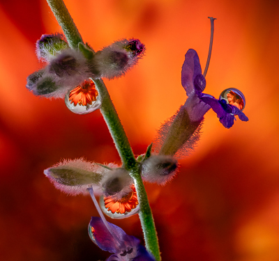 Gary, great result of this complex macro set up for flower and water drops photography. Very sharp result, but I think less will be more. The small drops image of the Gerbera are overpowered by the purple Russian Sage. I believe this crop does justice to it |