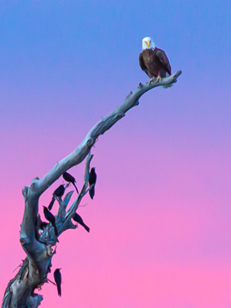 Mike, I can get why do you like this image so much: light and colors, composition with the dry tree going up in an angle and the presence of the eagle crowning the tree, and the additional multiple black birds. Unfortunately, none of them stands out. A tighter crop will make the eagle be more obvious. I did crop it but since it is a low resolution image it became very noisy. With the new features in LightRoom I added some light to the eagle, and reduced the noise. |