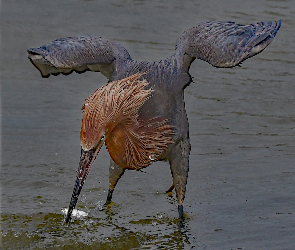 The Reddish Egrets alway put a whole dancing show when they are fishing. Recently we were given the show of two of them fishing at the same time in Fort Desoto. Using the ACR masking brushes, a combination of giving more light to the bird, and darkening slightly the water, makes the bird stand out more with the caught fish. I thing the crop is a little tight. I would have given a little more canvas on the left (my left) |