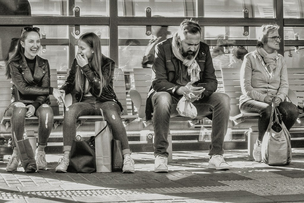 Kathleen, what really makes this image is the body language and interaction of the two girls on the left. The man on his phone has become the common city scape. The woman in the other side is minding her own business. I like the B&W interpretation. The image is sharp, and perhaps, a little bright. so I reduced it slightly. |