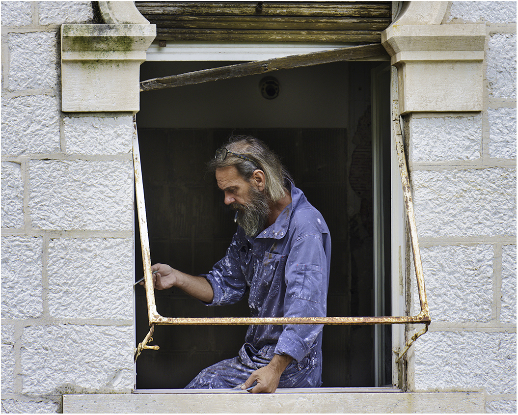 Bruce, this is a timeless image of a man working around an old and partially dilapidated building given by the window frame with no glass, the broken wooden shades on top of the window frame, and the raw walls inside (I gave a little light to the area to take away the mystery). Indeed, he is minding his own business very calmly and enjoying his cigarette. |