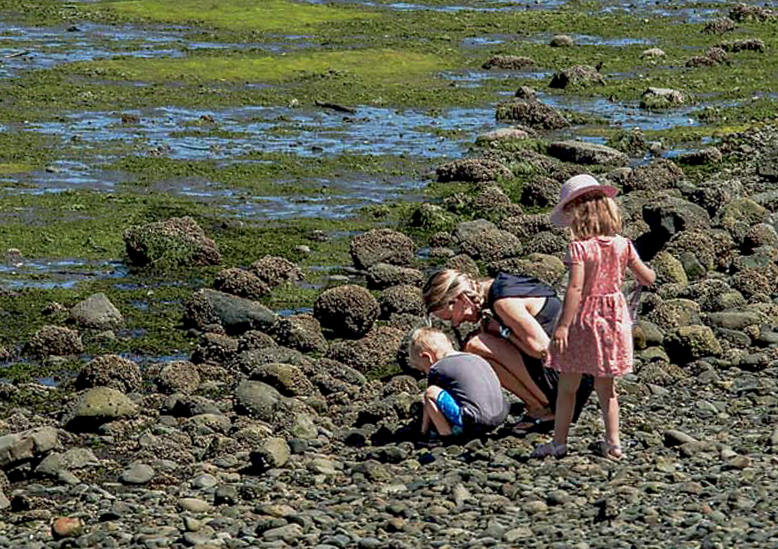 Ed, All the attention is centered in the mother with the boy looking at something in the ground, and secondarily in the girl standing up. It is a very rocky beach, not really suitable for swimming, or perhaps it is low tide since there is abundant green which implies water. Overall, I think that a tighter crop makes the family group stand out still preserving the environment. I cropped it. |