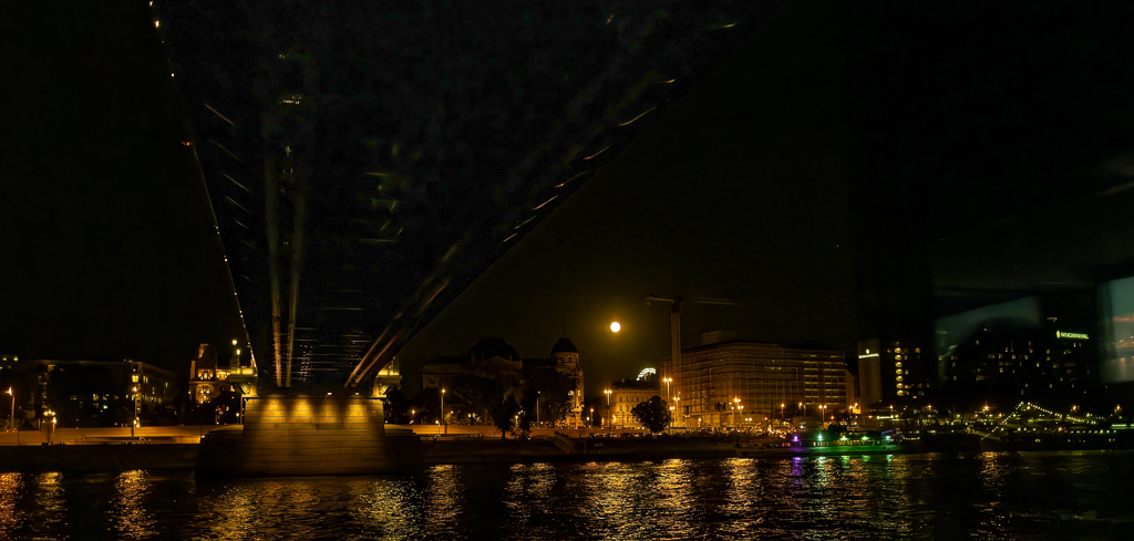 Vella, in Budapest there are several bridges. To me the most interesting is the Chain Bridge with the big lions. I could not tell if this is it. I see that you did some PP to your original image and obtained a more illuminated version, but I still think that the underpart of the bridge is too dark. Using the masking brush in ACR, I added more light, now we can see better the structure. The full moon adds interest to the image. |