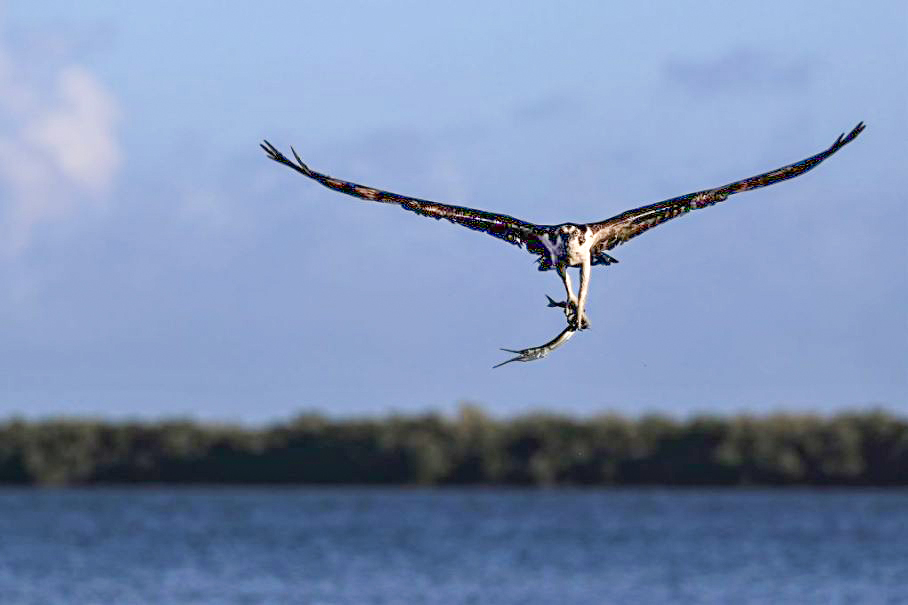 Marge, good catch. It is very good that the Osprey already came out of the dark background to the blue sky, which makes the bird stand out. I see the bird dark with no details. Using the ACR masking brushes I added some light to the bird and now you can see more color and a little more detail, not better because the image is very low resolution. Was this a big crop ? |