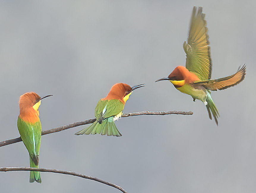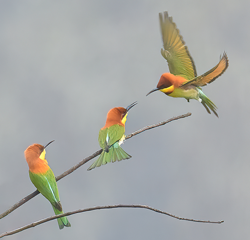 This image of the Bee Eaters is so nice, and sharp. It must have been raining very hard for the rain drops leave a trail at 1/250 sec. The interaction of the two birds is like they are having a conversation, and "she" is telling "him" not to show off in front of the other girls. The colors are also very vivid. |