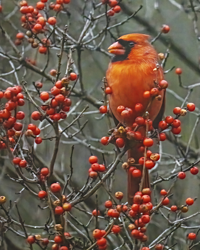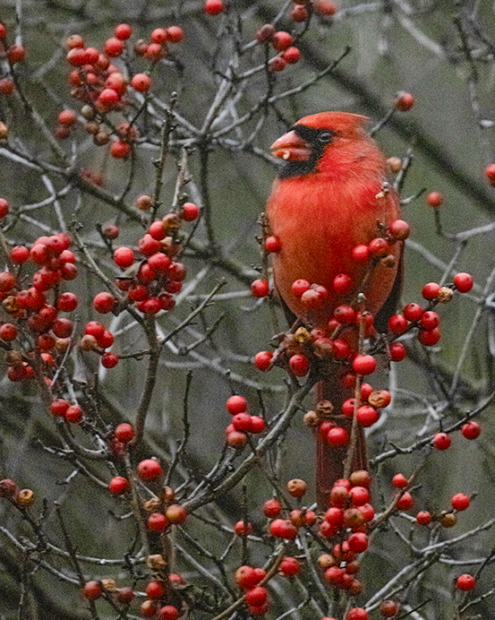 Jim, Cardinals are one of my favorite birds. Lucky you to have those berries growing in your garden and therefore, the variety of visitors you get. In spite of using the Topaz Sharpen AI, the birds still looks slightly soft, but there is only so much you can do with an image created under those circumstances: TC and high ISO. I did crop the image, since I think the Cardinal is perfectly centered in the frame, and also removes part of the berries which slightly overpower the bird. |