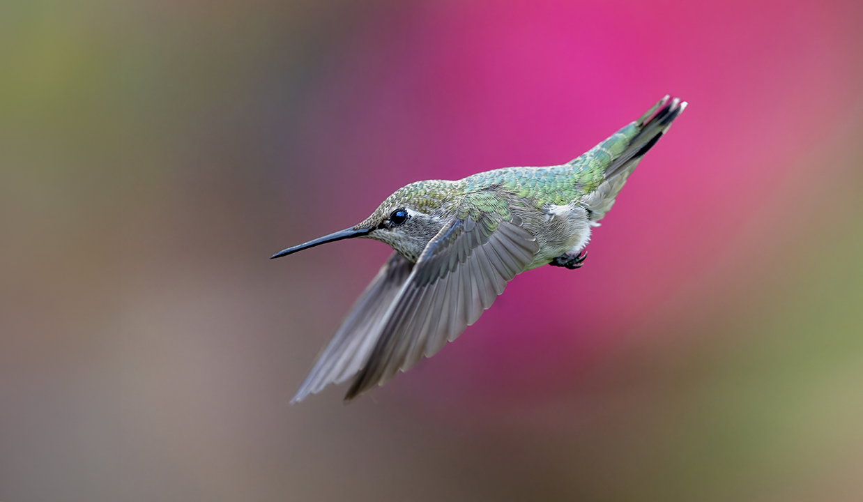Bruce, beautiful frozen image of the hummingbird. The pink flower out of focus in the background creates a perfect frame for the bird. I added some canvas to the front of the bird so it has room to fly into off center |