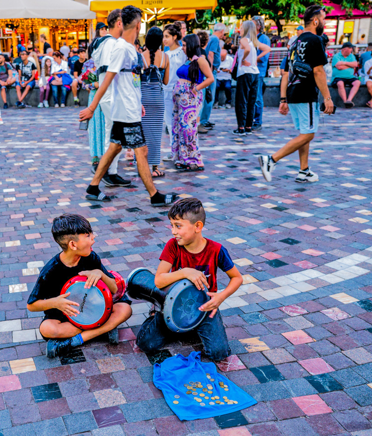 Pinaki, this is a great image. Indeed the main subject is the children that are having a great time playing the middle eastern drums and minding their own business. My view for the crop is even tighter to center the attention on them being off center as well. |