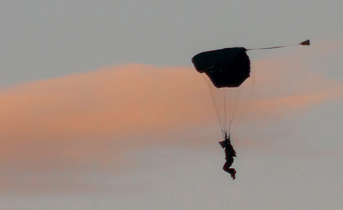 Ronald, nice silhuette of the skydiver. The color of the sky enhances the image. I think a tighter crop makes the subject stand out better. |