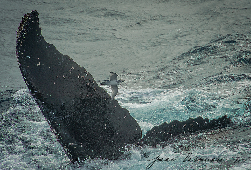 Adrian, it is always fascinating to me to watch these big mammals (yes breathing air, having hair, giving birth to live young, producing milk, and being warm-blooded) pretending to be a big fish. It is normal to watch birds flying by since when the whales feed there is a lot of left over that scapes hair-like bristles in their mouth to sieve prey from the water.