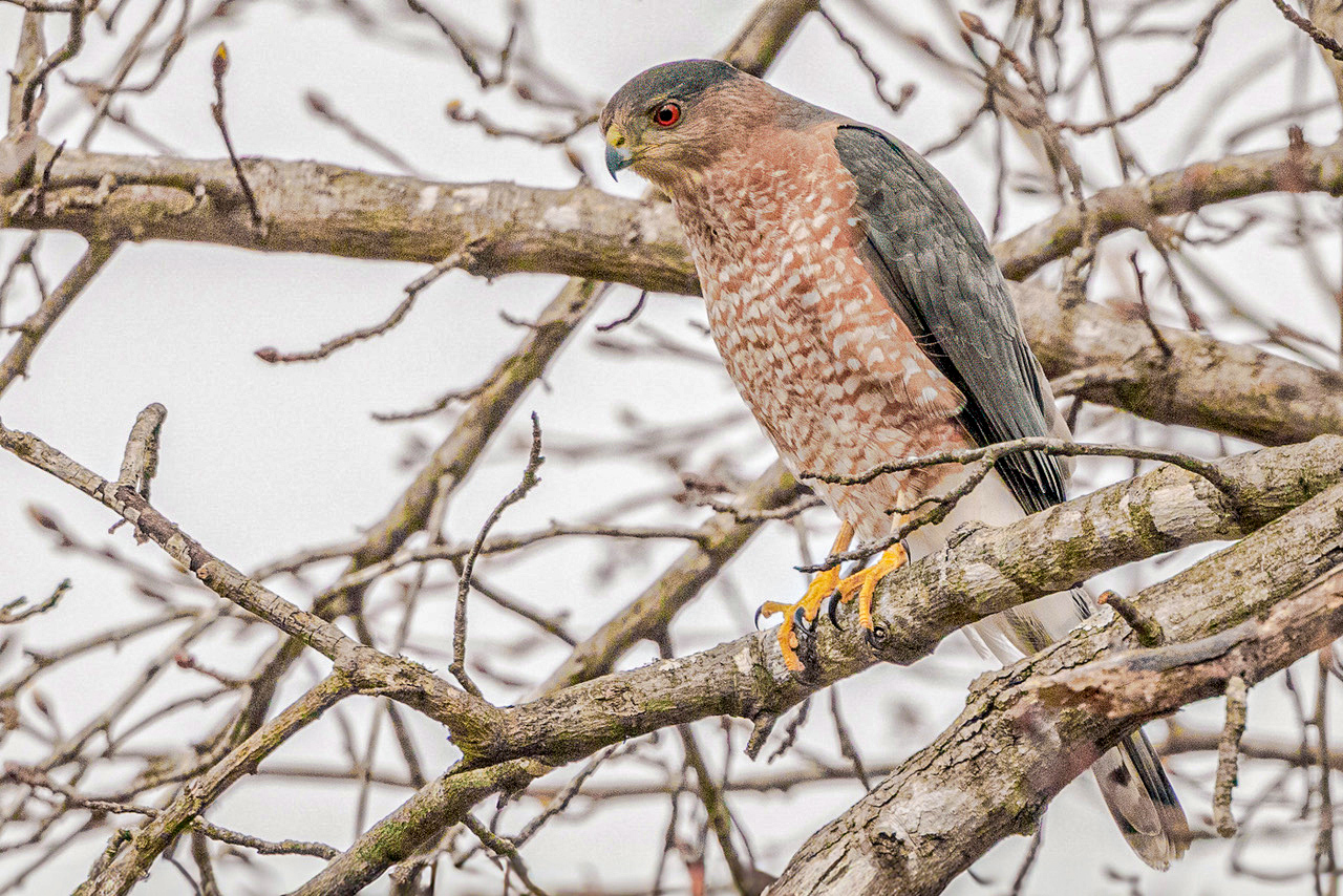 Barbara, the Hawk is on a stand by attitude looking for lunch. It is interesting when you observe them and they move their head from side to side. It is said that they do that to calculate the distance. The image is sharp and I added some contrast and clarity. Your crop made the bird stand out in the frame. |