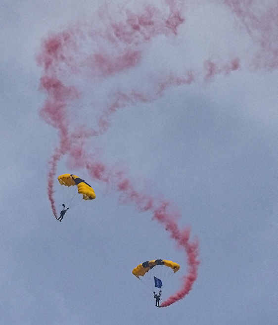 Gerald, this is a compromise shot. Getting the whole image in context implies sacrificing the size of the performers. As Ronald said, I preffer the main image but I would crop it tighter without cuting the smoke. |