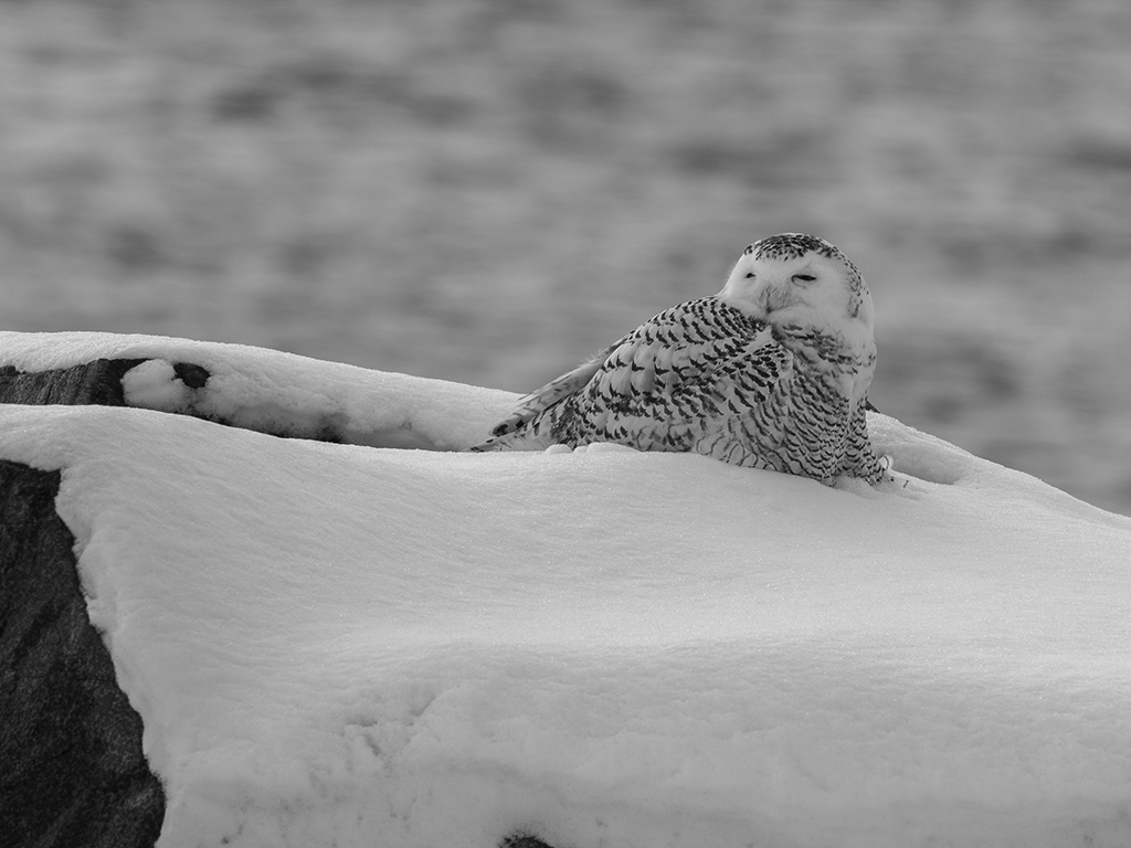 Richard, indeed to photograph a snowy owl is a privilege. I have never seen one in the wild. Your image is sharp, but dark, and there is too much empty space which overpowers the owl. You can crop tighter and still get a sense of the environment and make the owl stand out more. I added some light as well. |