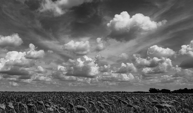 I like this scene, and love this sky, Jen, but my immediate reaction was, I want to punch it up a bit. See if you like my edit, but if you prefer softer, that's fine too. Sunflowers are so colorful, you don't often see them in black and white (though I've done it too!) and I think they do work because of the repeating patterns they provide. Very nice. |