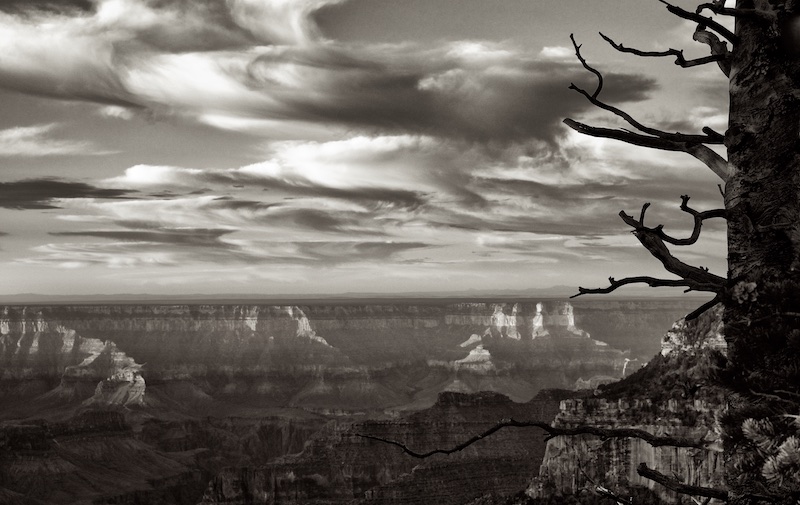 Very nice, John. Looking up into trees images can tend to look all the same, but you've composed this very nicely, with the big trunk at left, I like the originality. One suggestion, would be to increase contrast in order to provide richer blacks, either in the tree trunks, or the sky, or both. |