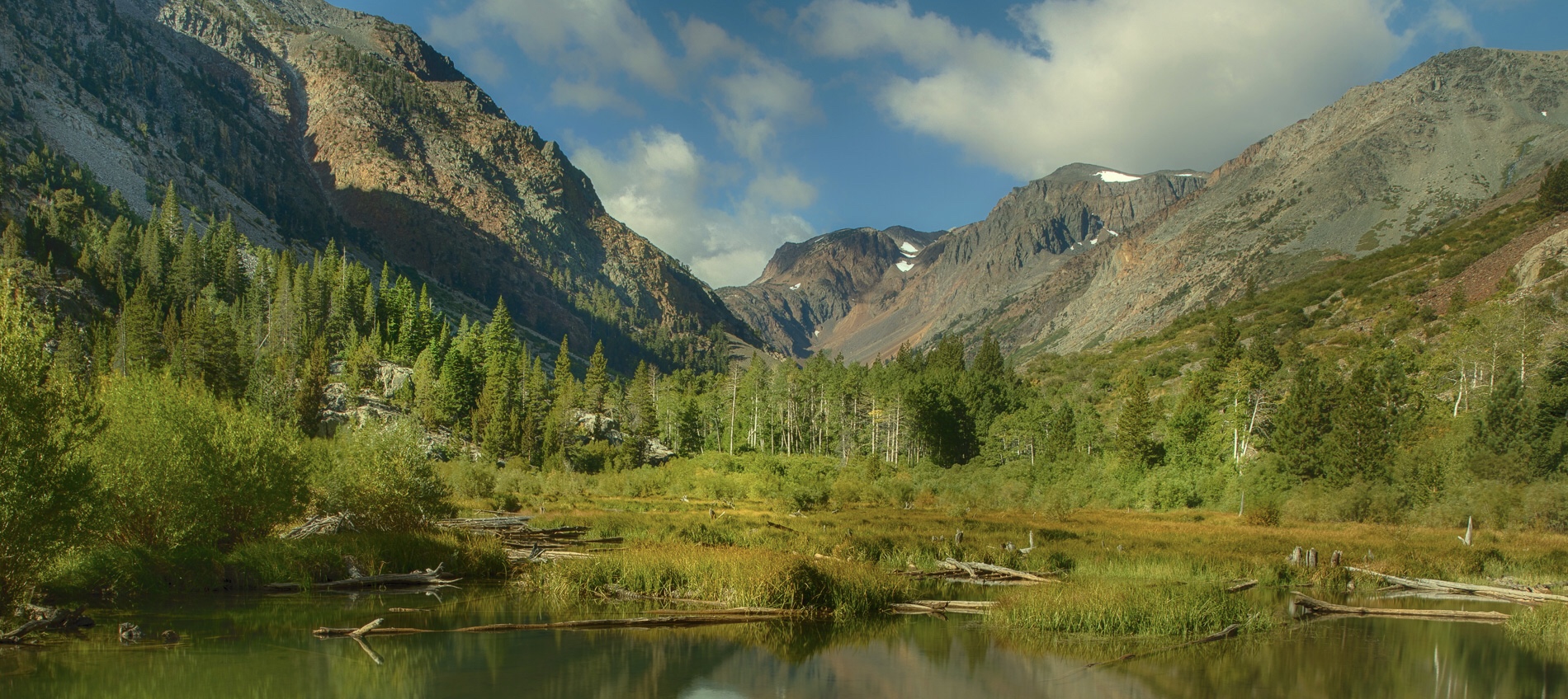 This is a beautiful mountain scene and while I agree with some comments I disagree with other comments. For me the muddy foreground is a distraction. I just did a simple crop into more of a panorama. For me the mountains and the valley are the main focus and not the reflection. The water although calm looks murky or flat without a nice reflection. I agree with Mike in boosting some of the color in the mountains and maybe a little more contrast. |