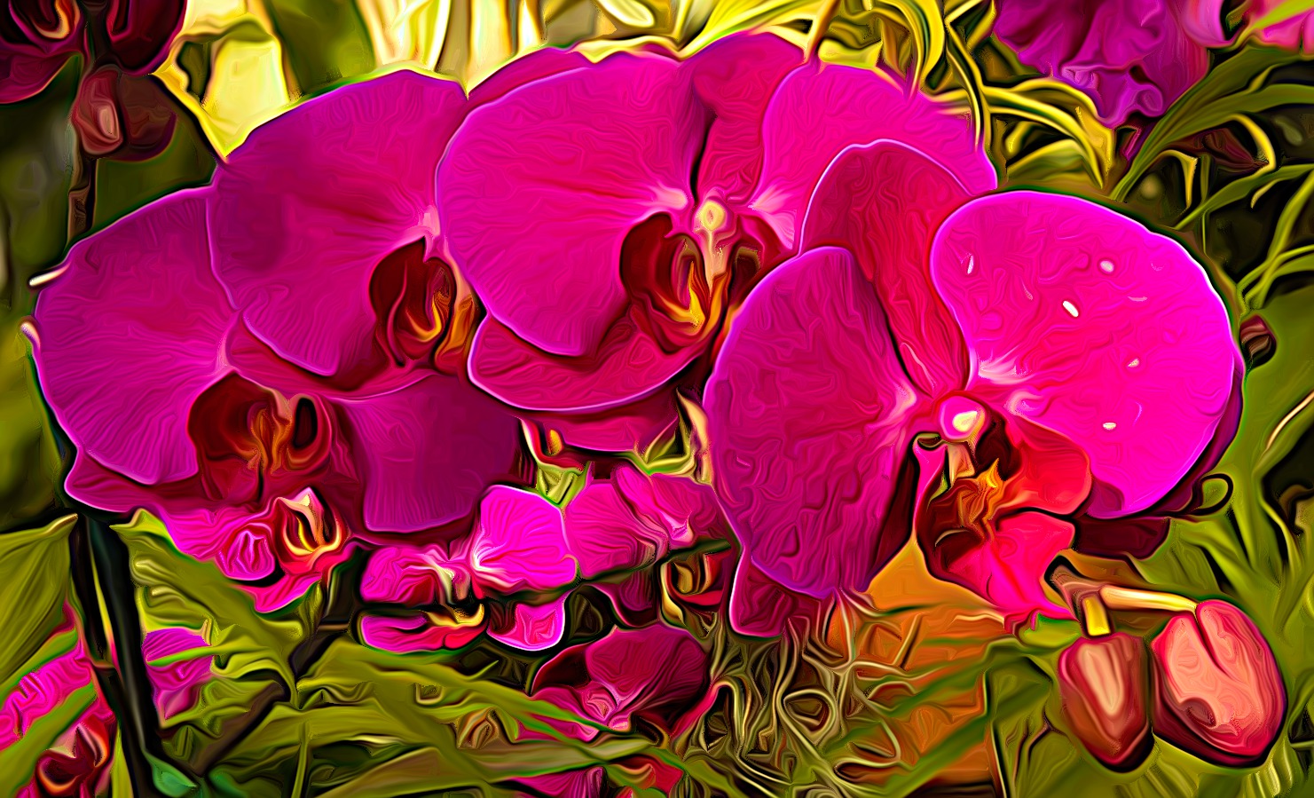 Congratulations on tackling focus stacking. It can be a real challenge and I think you did a good job with the flower. To me this probably was not the ideal situation or setting to do focus stacking because of the very busy distracting background. I would encourage you to try a single flower against a simple background such as a cut flower in the house with a simple background. I have done that with great success. For me it would be a monumental effort to mask out the background. Just for fun I put your image in Topaz Studio and put an abstract filter on it. You may not want to do this but it does decrease the distracting background. I also cropped it tighter. |