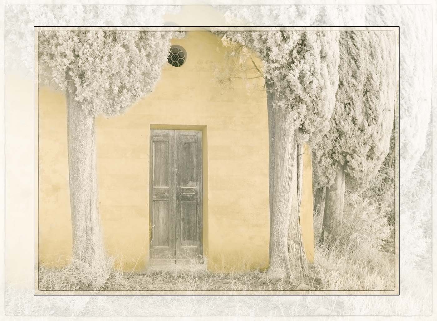 I like the old barn,trees and clouds. Nice conversion, and like the added frame. For me it's a little to much white. |