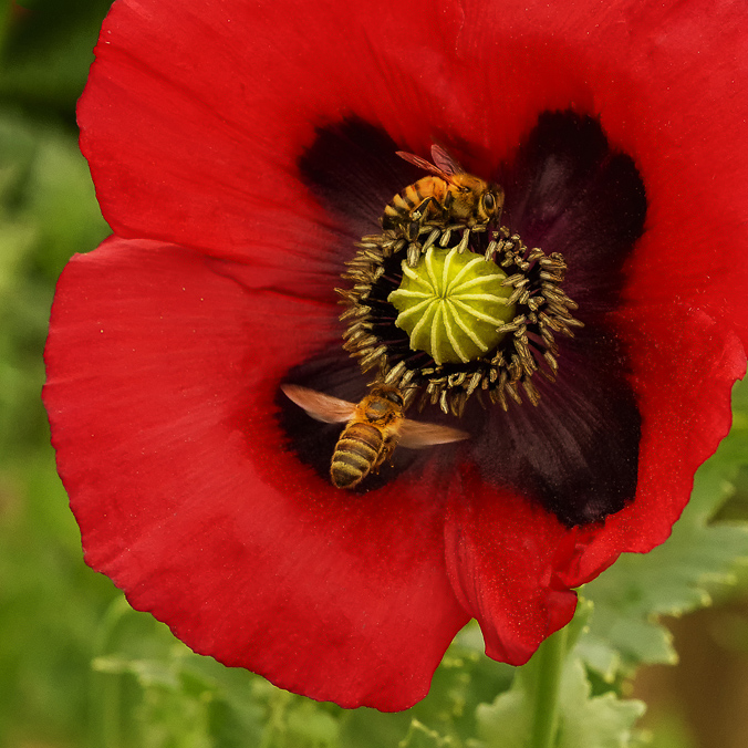 Wonderful colors and subject which tells a nature story. Your focus is good. I would consider a tighter, off-center crop because the centered composition now is a little static. I would also suggest dodging the bees to lighten them up a little. |