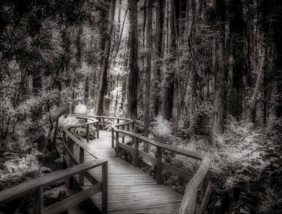 The winding foot bridge is a wonderful way to lead my eye into the frame. This image gives me a peaceful feeling of solitude in nature. I also like the mono version better, but I would add just a little more detail into it. I like the "glow" effect, I just think it is a little too much. I like the break in the foliage at the top and would accentuate the light even more and crop a little off the left so that the foot ridge and light are not so center. |