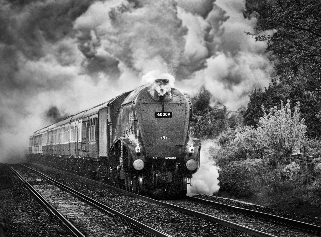 I really like the composition with the diagonal of the tracks and train and you left just the right amount of space around the train with room for it to move into. The steam is the icing on the cake! It's a very nice way to showcase the train. I would suggest darkening the background to make the train "pop" more. |