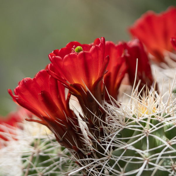 This image had impact for me when I first saw it. The red and green colors are very appealing. The flowers on the left are reasonably sharp, but those to the right are out of focus. I would crop in tighter on the left side. |
