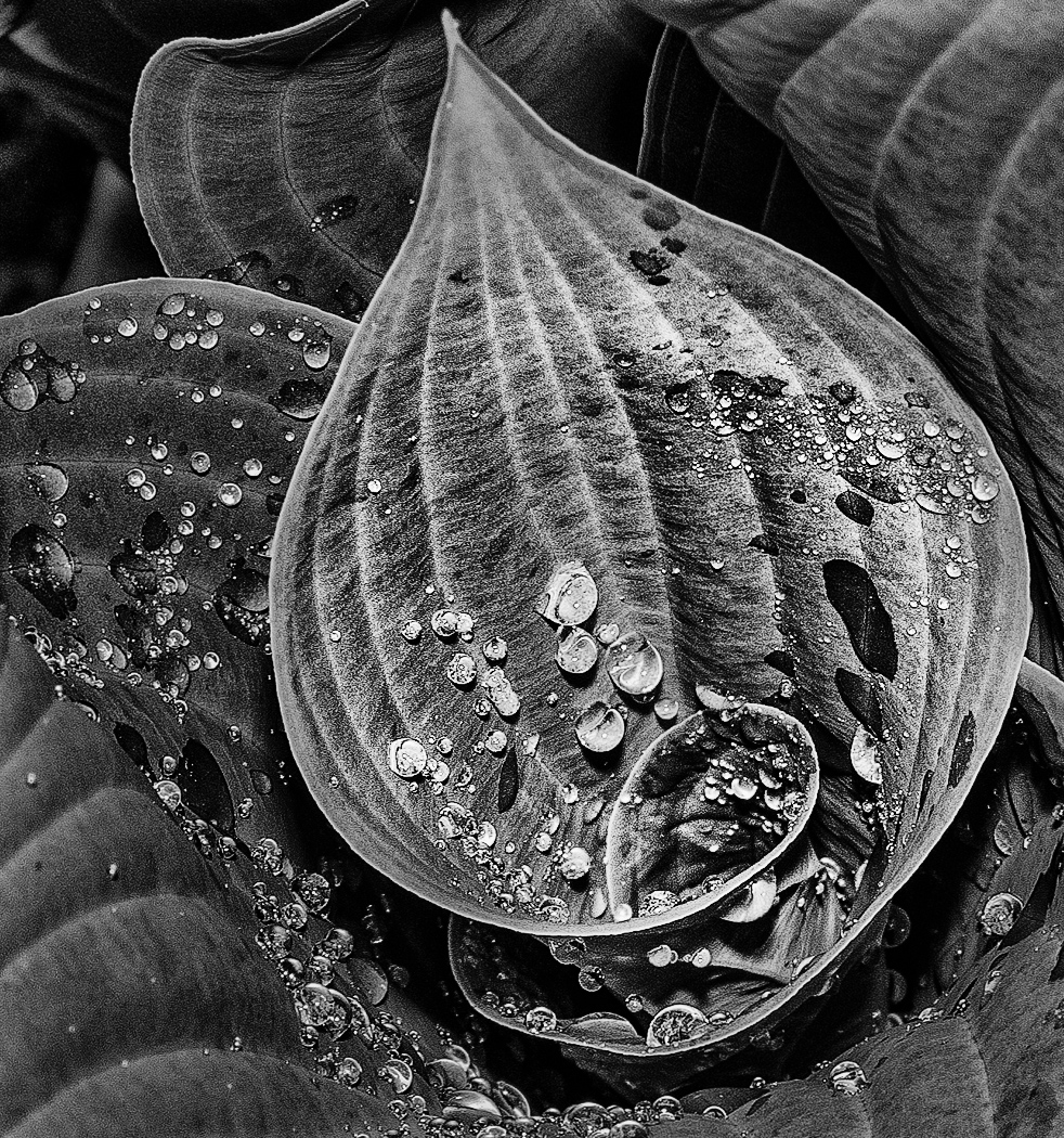 Your focus is great. I love the water drops and velvet feel to the leaves. I would suggest adding contrast and darkening the leaves around the center leaf to draw attention to it. |