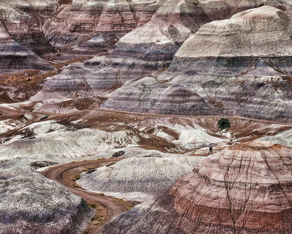 What a great capture and how nice of the person to be in your shot! The figure and tree are in a good spot in the frame and give perspective and vastness to your image. You have wonderful details and the S-curve brings me right into the scene. I couldn't resist playing with it a bit and I added some contrast and exposure adjustment to give it a little more depth. |