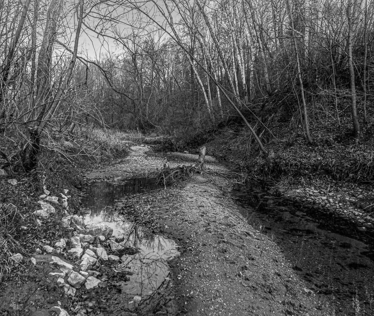 I think this scene is better as a monochrome. The reflection in the water on the left shows up much better in black and white. The curved, meandering dry creek bed provides a nice leading line carrying my eye through the frame. My only suggestion is to add more contrast to make it "pop". |