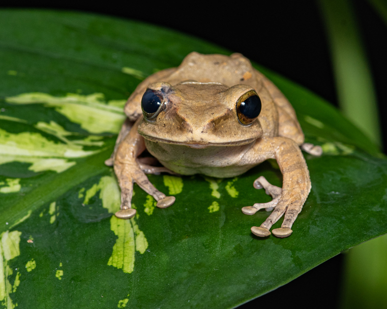 What a great shot and what wonderful details you have in the frog and I especially love the eyes. I have always wanted to get a good frog pic. For my taste, I think there is a little too much space to the right of the frog. I cropped in and flipped the image - just a matter of taste. It's wonderful the way it is. |