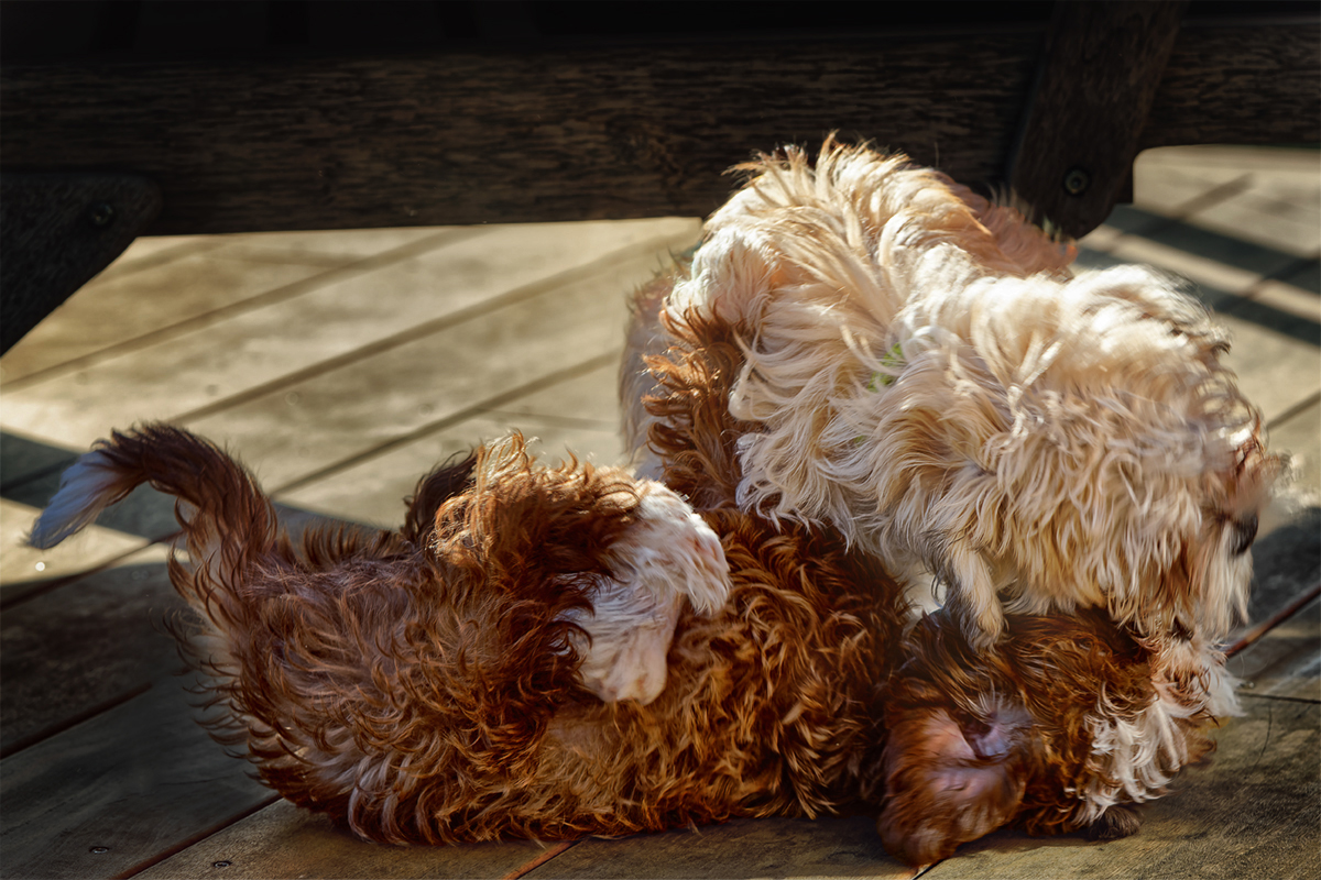 A ball of fur! You captured a fun moment. You have nice details and texture in their fur. For my taste, the background is too bright. I blurred and darkened it. I only wish that I could see an eye or two. |