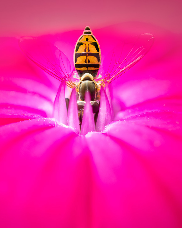 I like the focus, details and clarity of the hoverfly. The contrast against the soft flower and the contrast in colors are nice as well. The centered composition fits this subject well. I wondered if you need so much negative space around your subject, so I did a verticle crop. Not sure, what do you think? |