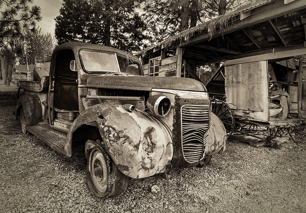 This is my kind of photo! What a great find. You composed the shot well, but the cut off tire did bother me. I like what James did to complete the tire and get rid of the fence. Your sepia tone works well here. I also like the tones in the color version. I added a little contrast and a slight vignette. |