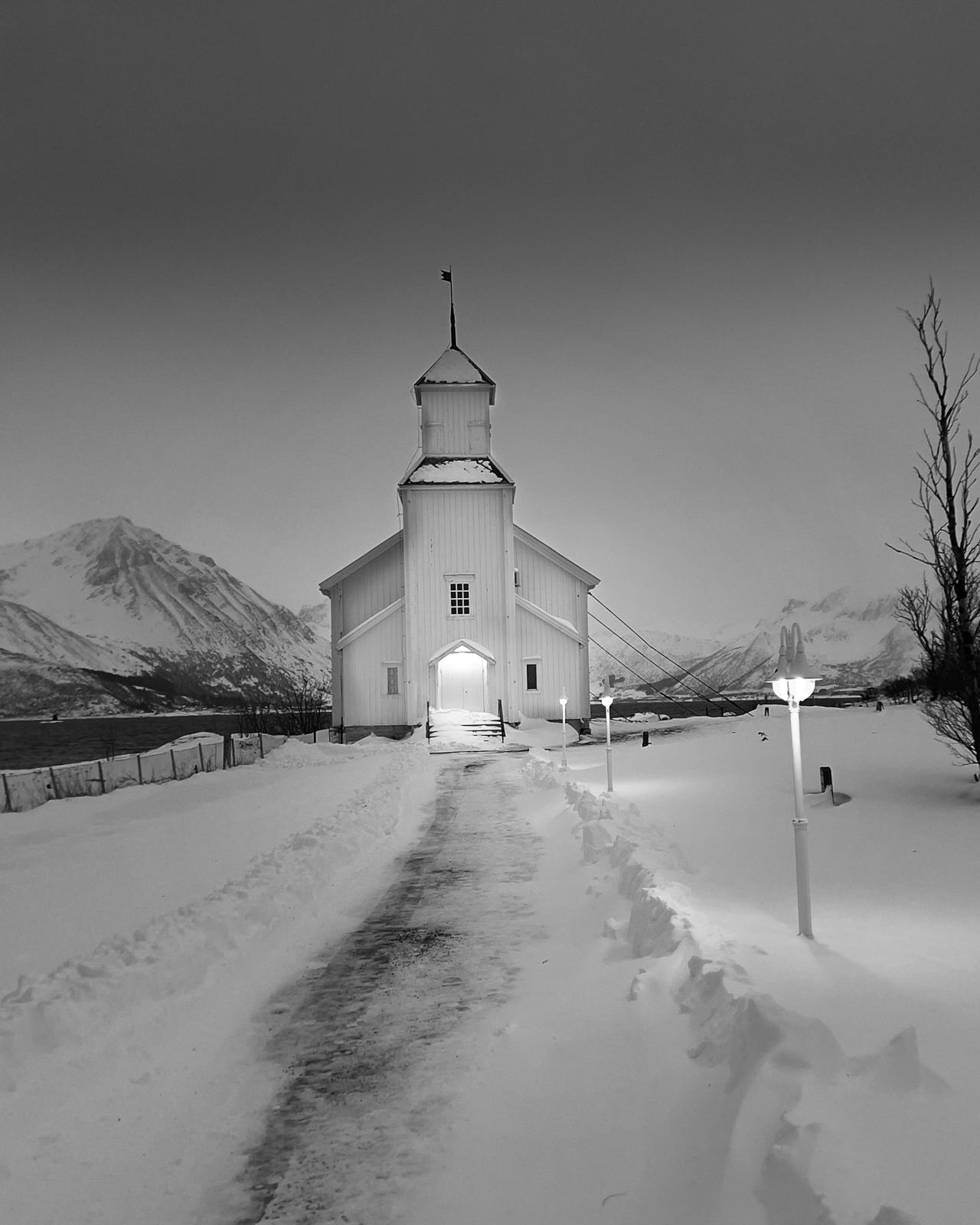 Love this photo which is perfect for monochrome. The path leads my eye to the church and the lovely soft light. To me, it looks like it is leaning slightly to the left which is easily corrected. I also lightened the area around the front right of the church to add more reflected light from the church. I noticed a halo around the steeple. |