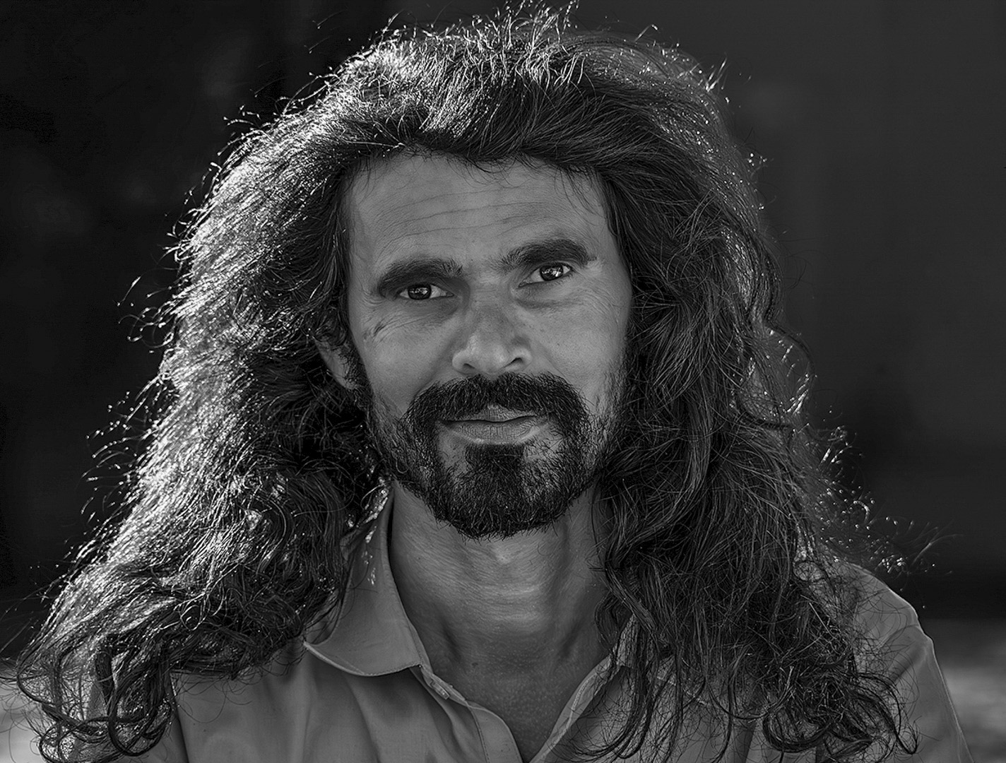 I agree with everything Butch has said,this gentlemen so holds your gaze,I was thinking of lightening the eyes slightly but there are great catchlights in both eyes so I would leave at that,the light hair is wonderful rim lighting but as already said I would darken it slightly and for the darker areas of the hair I would just lift the shadows a touch as I am sure they may be a touch of detail that could be brought out in it,a wonderful engaging portrait.