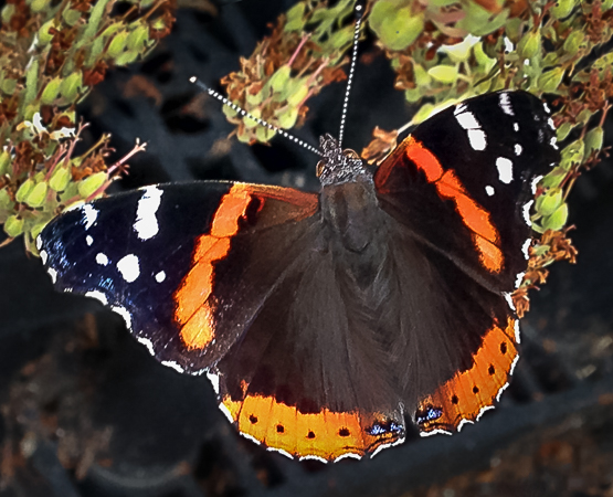 This is a real interesting shot and also a post processing challenge. The subject is obviously the butterfly, the composition is almost straight down, the colors are great but the whites on the wings look blownout, and the light is OK. I think you got a good start in post processing, but some additional tweaks will help. 1) Crop in some more to remove the 2 white flowers close to the left edge (light color along the edge always attract the eye) and a bit on the bottom; 2) reduce the highlights to remove the blownout whites; 3) add a vignette to darken down the background; and 4) sharpen using the sharpening mask in Lightroom. I did these steps in Lightroom. See the thumbnail. see if you like it. |
