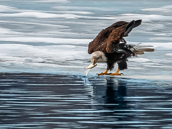 The subject is great and you captured the action. Unfortunately it is not sharp. Were you using a tripod with shutter release? The composition is OK but I would reduce the top and left sides to further bring the viewers eye to the eagle and his/her catch. The lighting is a bit bright in the top, but the cropping would reduce some of that. The colors are good and changing the foreground water to blue helps a lot. I imported into Lightroom were I cropped the top and left side and a little on the right. I sharpened and reduced noise, and adjusted the highlights and shadows. See the thumbnail. |