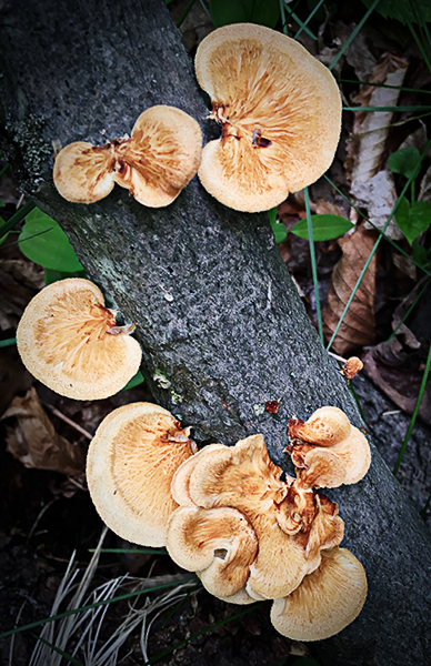 I like the color detail in the mushrooms. Composition is good but the lighting is a bit bright in the background. I think you could strengthen the vignette to tone the background down more, and the white leaf to the right of the top mushroom could be eliminated or selectively darkened. The same for the grasses in the lower left.