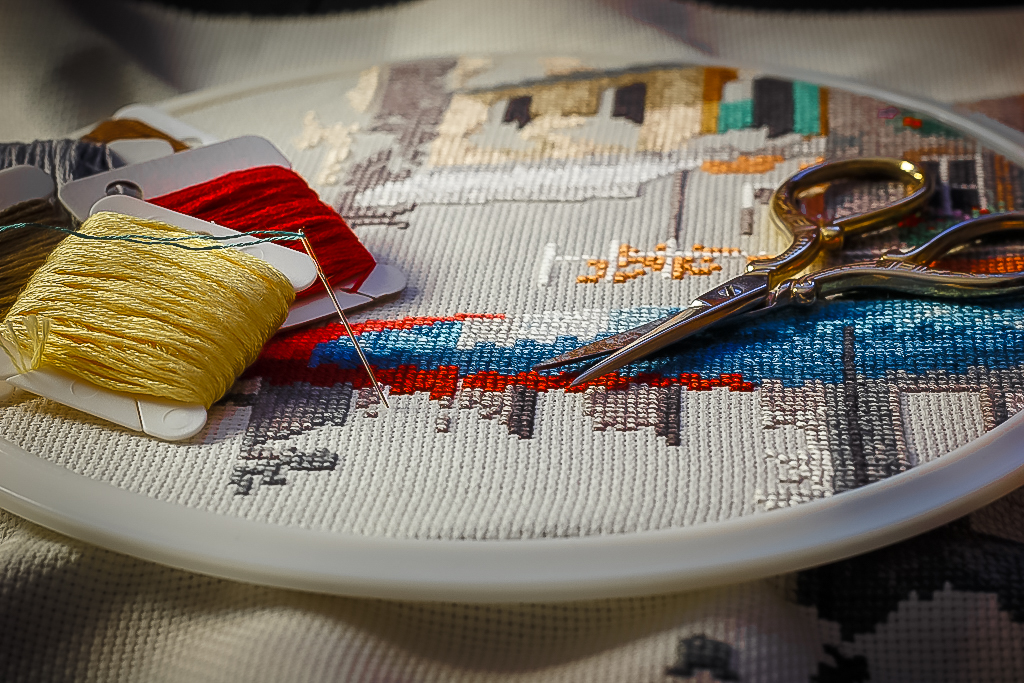 I like the subject and the arrangement of the yarn and the scissors. The side lighting works well and the colors complement one another. In my opinion the increasing the depth of field to get the back of the cross stitch sharper, and increasing the saturation of the colors would make it pop more. In Lightroom I add sharpening and saturated the colors. You an decide if you like it. |