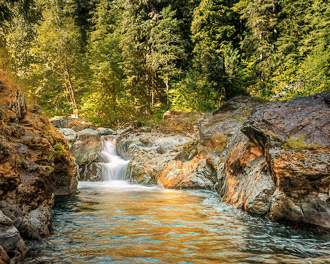 The colors and lighting of the trees and water reflections are the first things my eye sees, then to goes to the waterfall which is the subject. Ruth's suggestion of cropping the image to make the falls more the focal point is a good one. The lighting and colors are great. I imported into Lightroom and cropped. It became a bit pixelated but I assume that is because of the low res image. You can decide if you like it. |