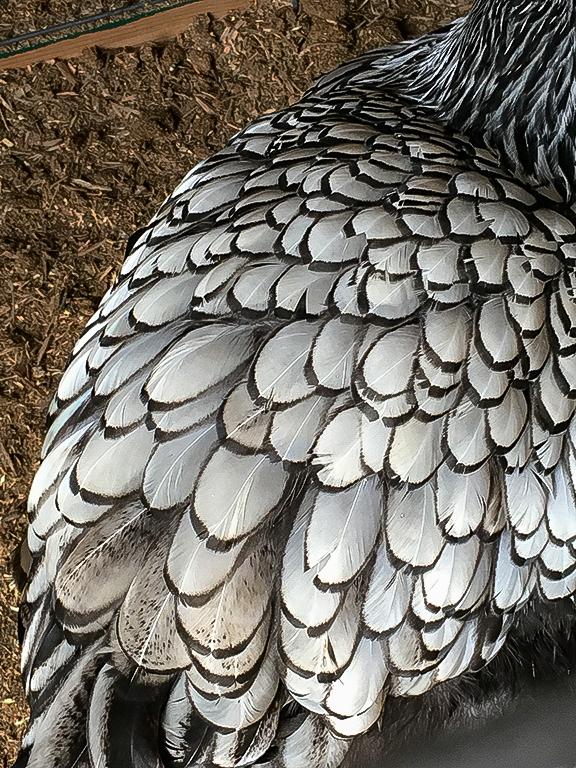 The impact of the feathers and their pattern is strong and clearly the subject. You goal of including a bit of the environment to show the place would be be clearer if you backed up and showed a bit more of the surrounding area. The lighting is OK, but as you point out a chicken barn does not have studio lighting. The one thing which I noticed immediately was the brightness of the wood shavings which drew my eye. I took the original photo into Lightroom where I reduced the highlights, increased the blacks, added some clarity, dehaze, and vibrance. I then exported to Photoshop where I selected the bird, inverted the selection and reduced the brightness and added a little contrast to the wood shavings. It result is attached. You can decide if you like it.