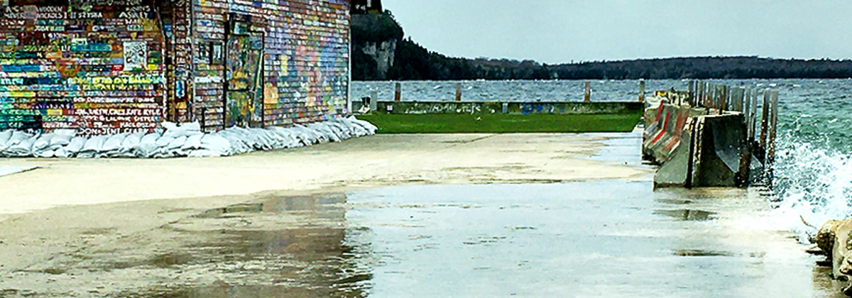 A good travel shot with a very interesting story. The colors are good and show enough detail for the viewer to tell it is graffiti on the building. Since the main focus of the image is to show the impact of the rising water, I would crop the top part out so the eye is focused on the sand bags and the over flowing water in the foreground. See attached. (There also is a good straight on shot of the the door and its graffiti and surrounding wood, if you ever get back up there.) |